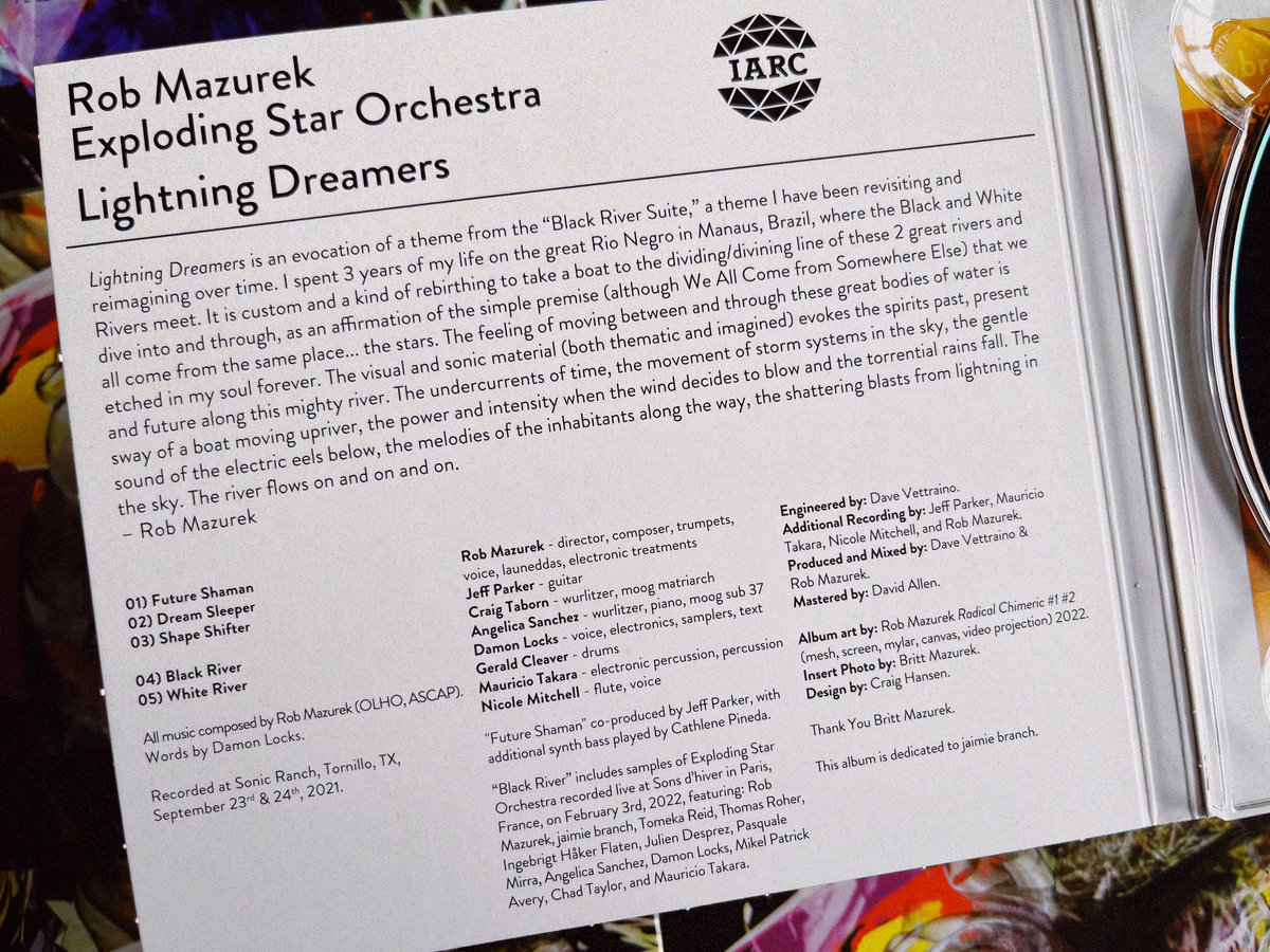 “Black River” and "Dream Sleeper" include samples of Exploding Star Orchestra recorded live at Sons d’hiver in Paris, France, on February 3rd, 2022, featuring: Rob Mazurek, jaimie branch, Tomeka Reid, Thomas Roher, Ingebrigt Håker Flaten, Julien Desprez, Pasquale Mirra, Angelica Sanchez, Damon Locks, Mikel Patrick Avery, Chad Taylor, and Mauricio Takara.
